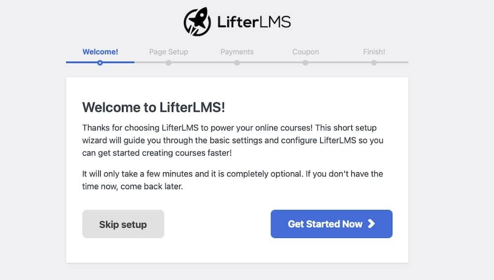 LifterLMS 将启动设置向导,引导您完成基本配置。按照提示设置课程环境。
