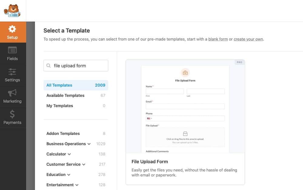 接下来,创建一个表单,其中包含学生姓名、回复和文件上传字段。在 WPForms 中,转到 WPForms> Add New,选择 File Upload Form,然后进行自定义。