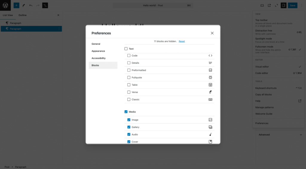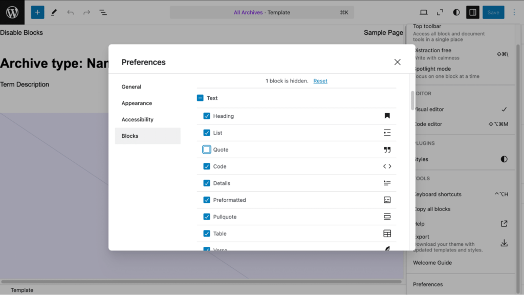 任何用户都可以通过区块编辑器中的首选项菜单禁用区块。点击右上角的三点设置(⋮)菜单,编辑器首选项就会打开。然后,在“区块”选项卡下,用户可以取消选中任何区块,将其从区块插入器中移除。