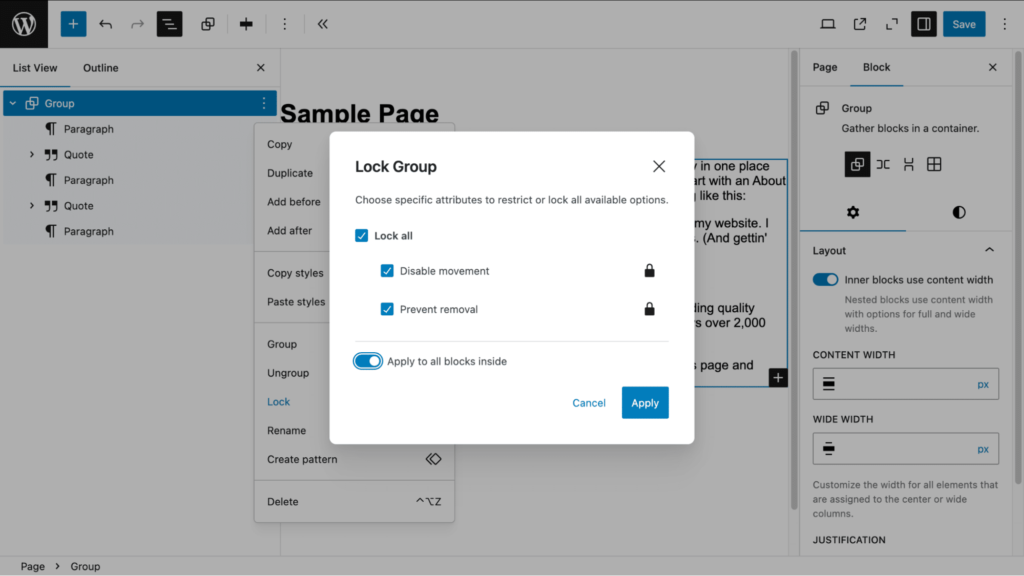 对于包含嵌套元素的区块,还可以选择只锁定父区块或锁定所有内部区块。这可以确保分组元素保持结构化,同时允许在其中进行受控编辑。