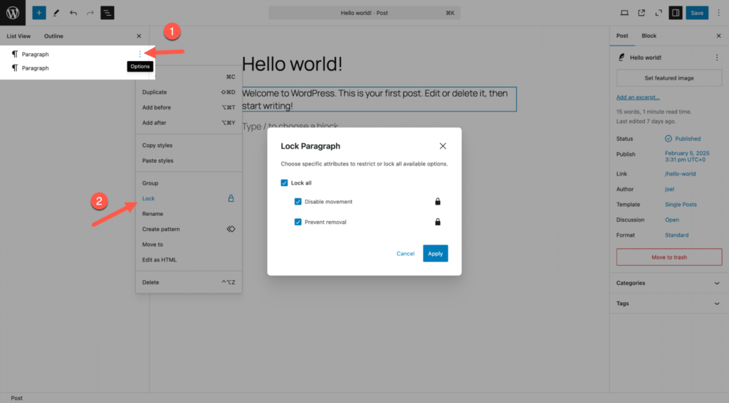 要锁定或解锁一个区块,请单击区块上的三点设置 (⋮),单击锁定,然后选择锁定全部选项,就会自动启用防止移动和防止删除,但这些选项也可以单独应用。