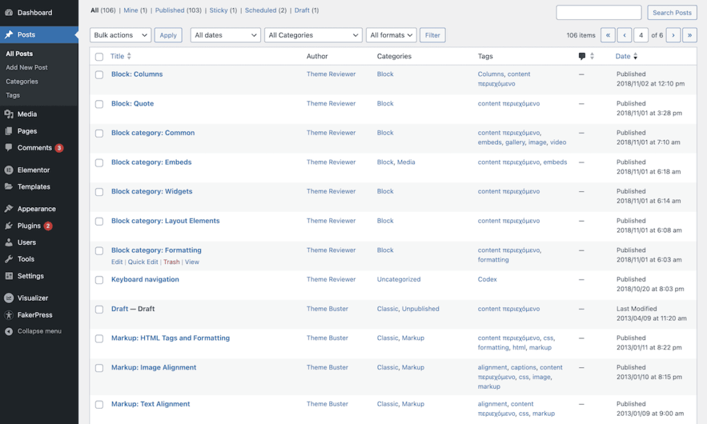 WordPress Posts 屏幕显示与主题单元测试数据相关的内容。