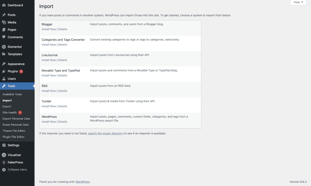 你可以在 WordPress 官方 GitHub 代码库或《制作 WordPress 主题手册》中找到主题单元测试数据 XML 文件。下载后,前往 WordPress 中的“工具”>“导入”页面: