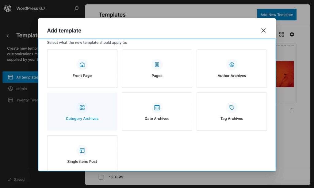 在网站编辑器中,导航至模板部分,点击添加新模板。系统会提示你选择模板应适用的内容类型。在本例中,我们选择了分类归档。
