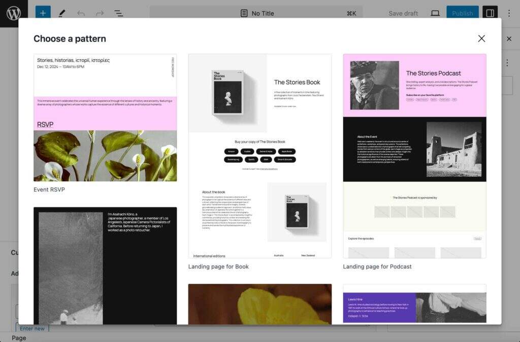 这些样板是预构建的布局,可以在页面中使用。创建新页面时,编辑器会显示一个覆盖图,您可以在其中选择一个区块样板。您可能想从着陆页面样板开始,然后根据自己的需要进行定制。