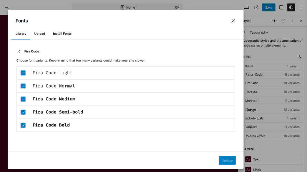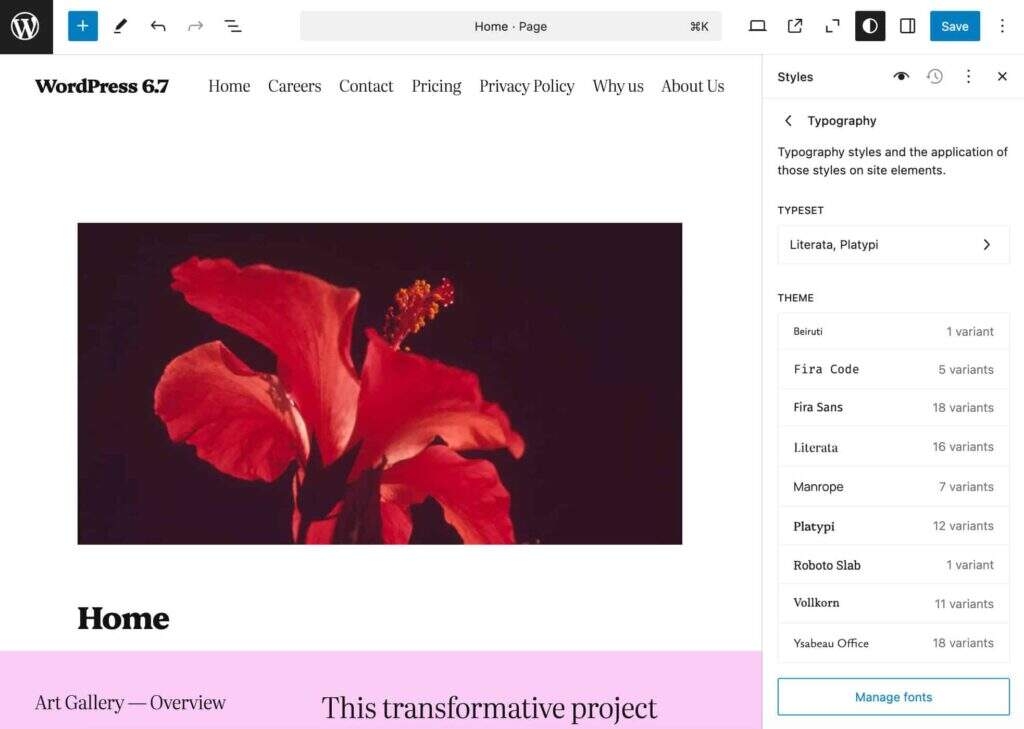 Twenty Twenty-Five 包含 9 种字体和多种变体。您可以在全局样式界面的排版下选择要在网站上使用的字体。