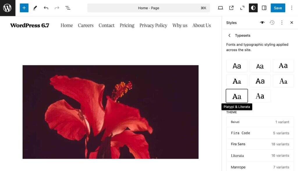 如果您选择第 7 号排版类型 Platypi & Literata,这两种字体将自动应用于网站的所有元素: Literata 适用于一般文本元素,Platypi 适用于网站标题、标题和按钮区块。