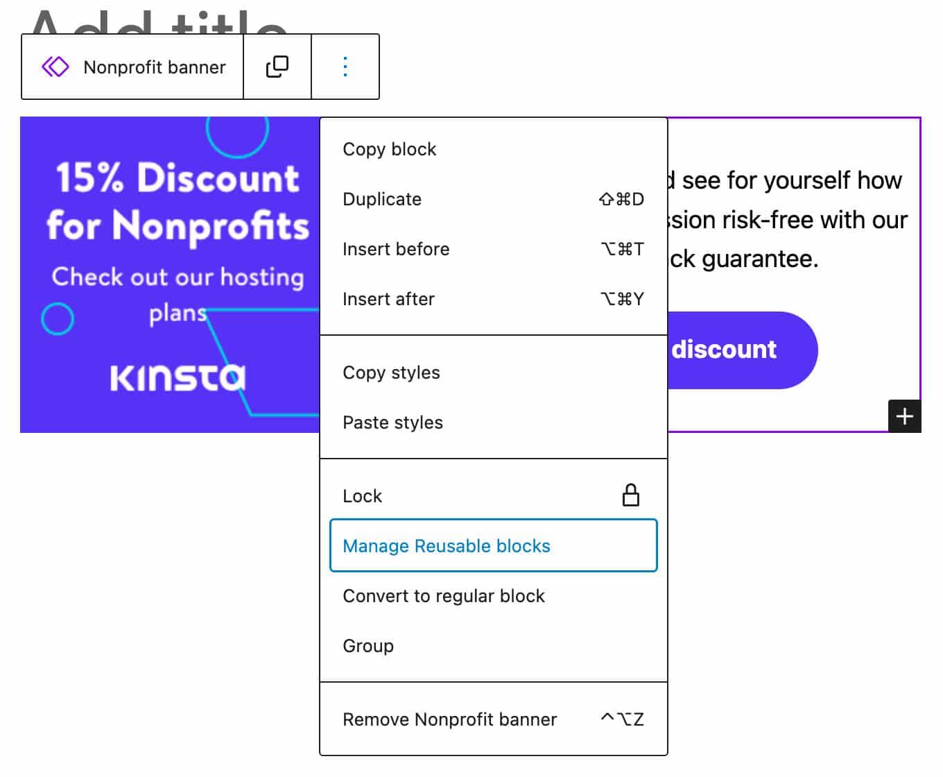 - 点击区块设置下拉菜单中的 “管理可重用区块” 按钮。
