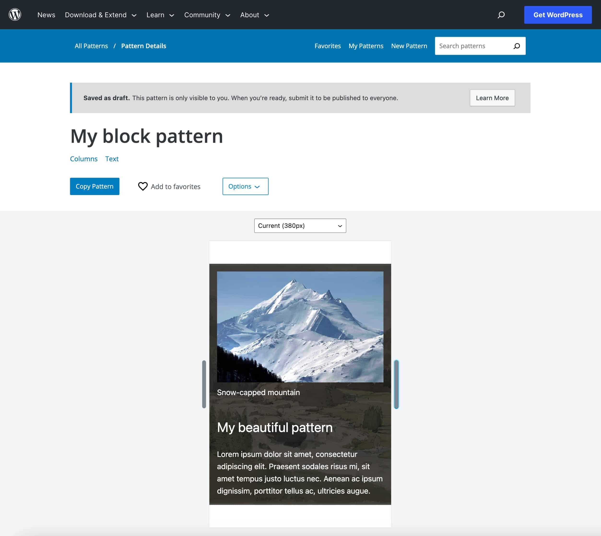 现在创建一个新的文章(或自定义文章类型),打开区块插入器,并点击样板标签。你应该发现一个新的样板类别(My Pattern Category),其中有你的自定义区块样板。请自由发挥样板属性,以定制你的区块样板。