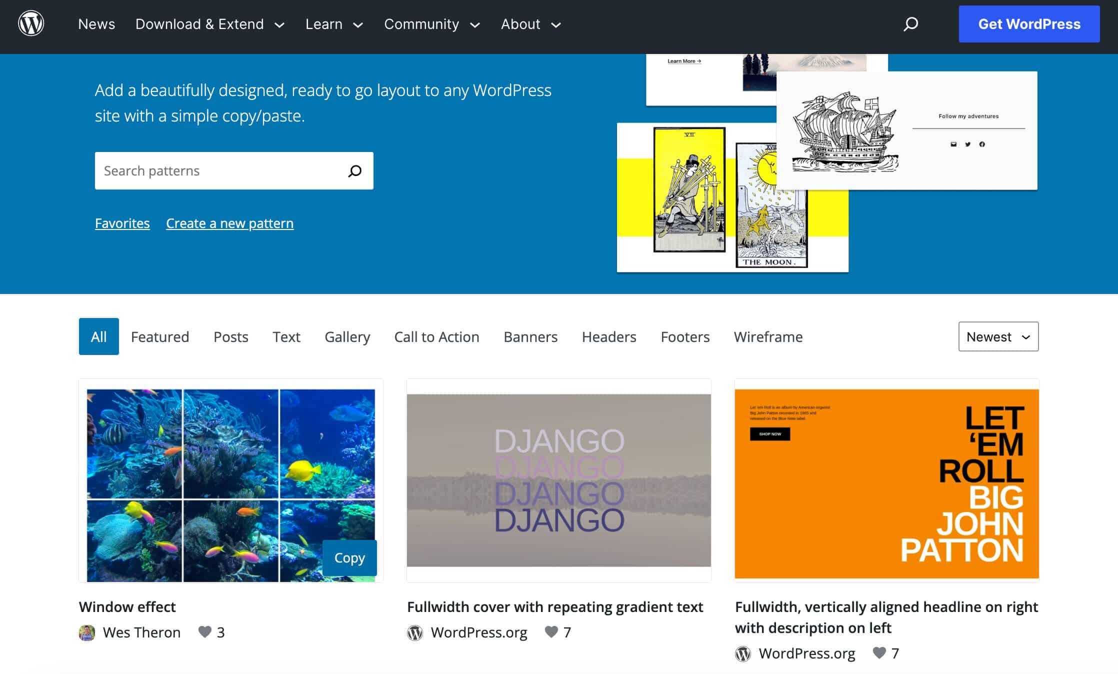 你会在区块插入器的样板标签中发现大量的样板,或者直接从编辑器的界面中探索区块样板库。你也可以访问区块样板网站,选择一个样板,然后点击复制。