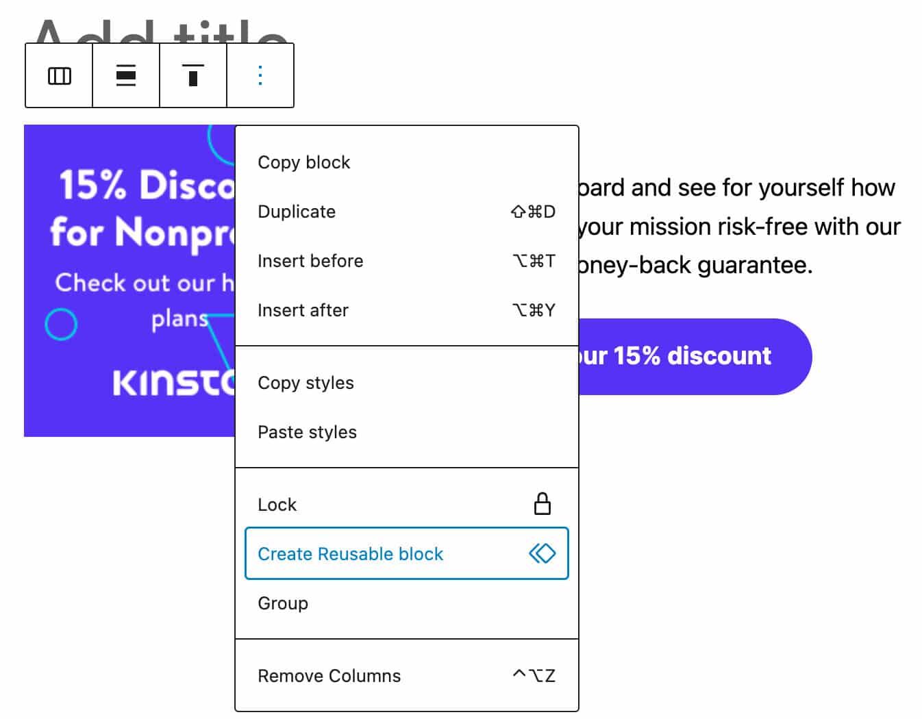 可重复使用的区块对于建立你可能想在你的网站的几个页面和/或不同网站上包含的元素特别有用。想想看,CTA、促销Banner、价格表,等等。