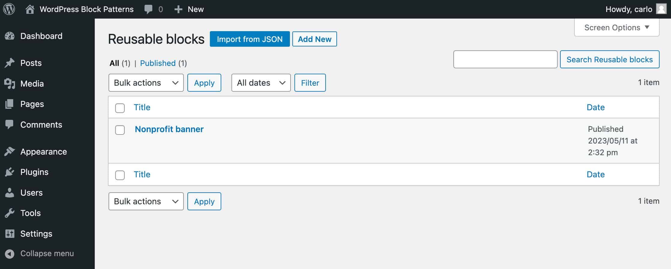 - 将/wp-admin/edit.php?post_type=wp_block添加到您网站的WordPress URL中。