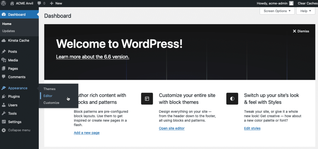 网站上的区块主题激活后,我们可以在 WordPress 管理面板中选择外观>编辑器,访问站点编辑器: