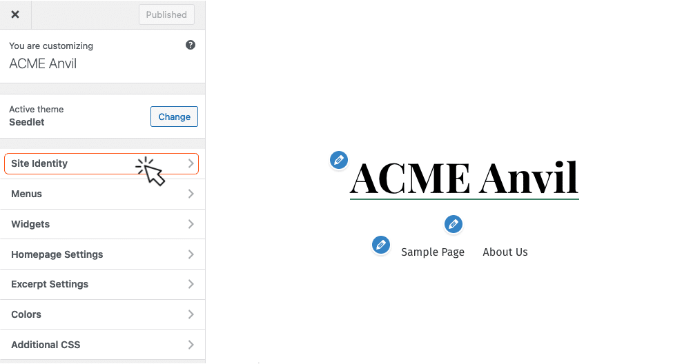 在自定义器主菜单中选择 “网站标识” ,即可访问标题中的自定义组件:
