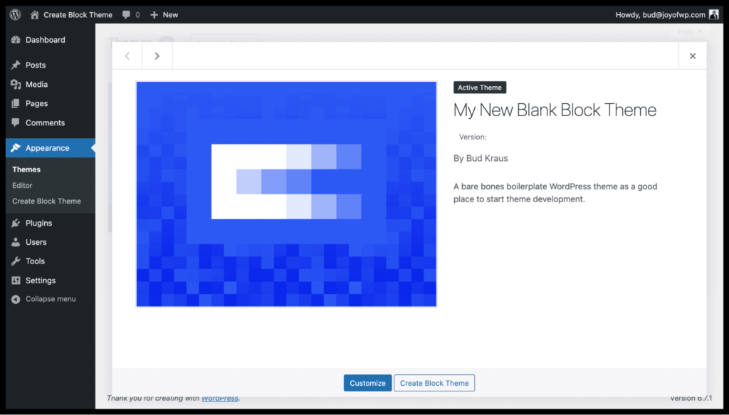 将这些信息添加到 style.css 文件后,在 WordPress 管理区导航到外观>主题。您将看到新创建的主题列表。点击查看主题详情时,您会发现您添加的所有信息都出现在这里。