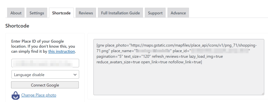 接下来,导航至 Shortcode 选项卡并输入您的 Google Place ID。您还可以自定义一些设置,例如评论的显示方式。
