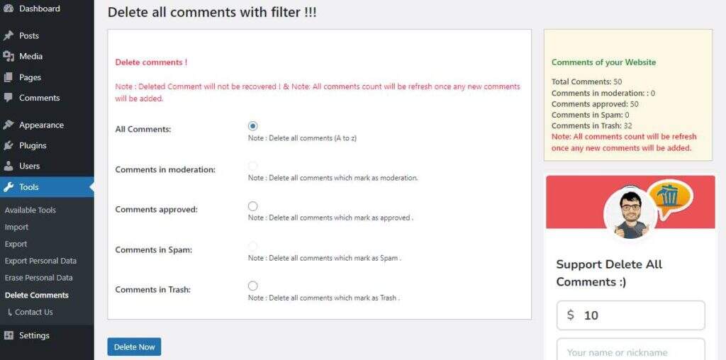另一个插件是 Delete All Comments of WordPress。这款插件非常简单直接;它可以一键删除网站上的所有评论(或某个类别中的所有评论),没有任何免费功能。设置简单快捷。