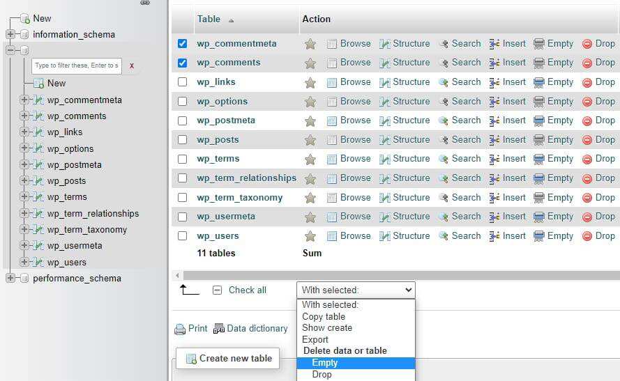 在选中这些表的方框上打勾,然后在屏幕底部点击 “With Selected:” 下拉菜单,将其更改为 “Empty“(记住是 “empty”,而不是 “drop”,因为 “drop” 会删除表)。