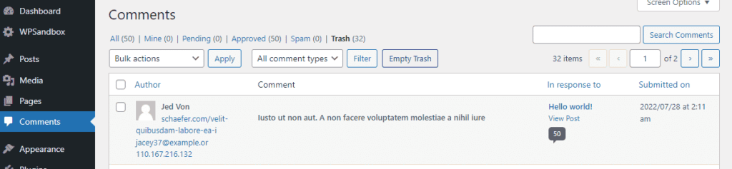 WordPress 通常会在 30 天后清理回收站,但如果你想现在就永久删除所有评论,请转到回收站选项卡(在评论标题下方)并点击清空回收站按钮。