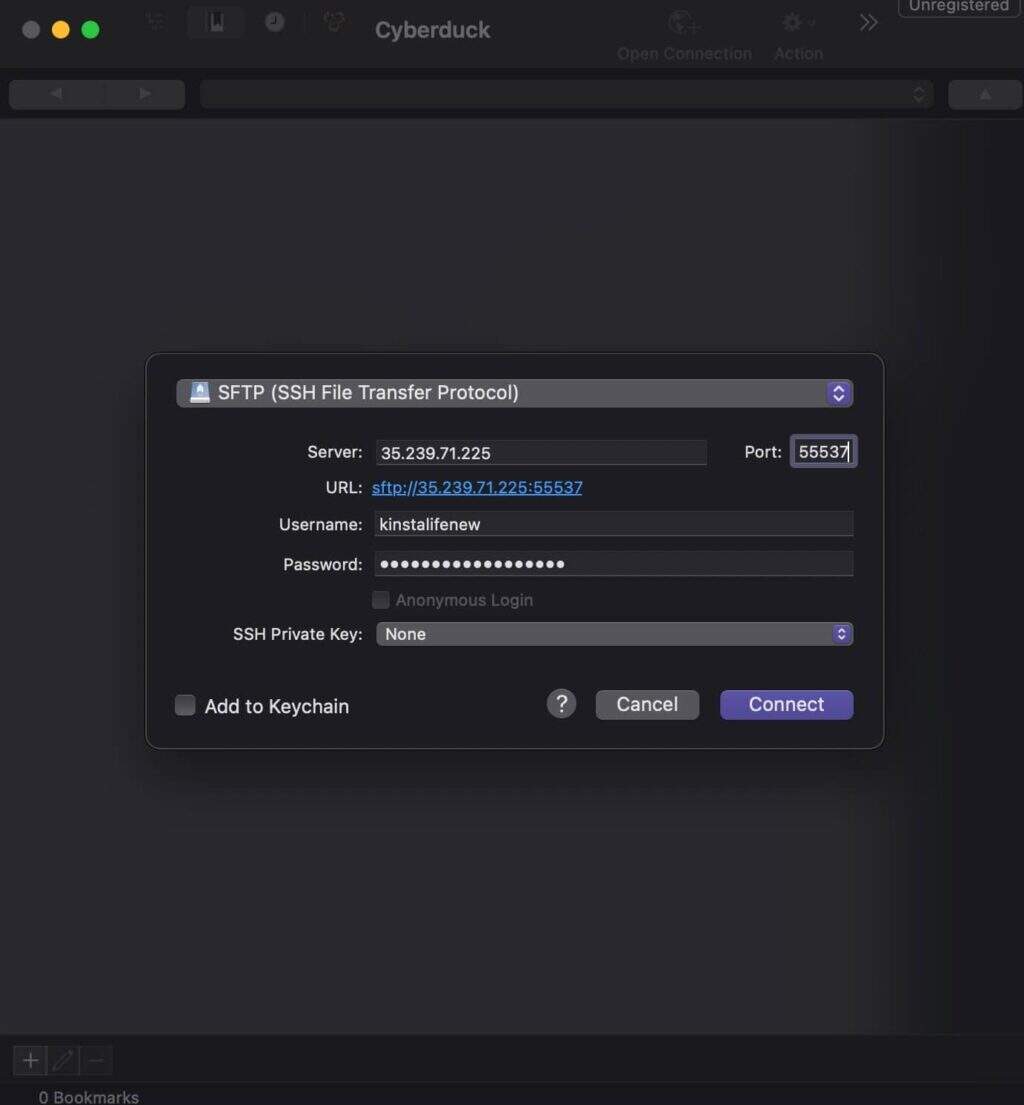 使用 Cyberduck 通过 SFTP 连接到网站。