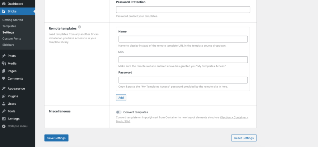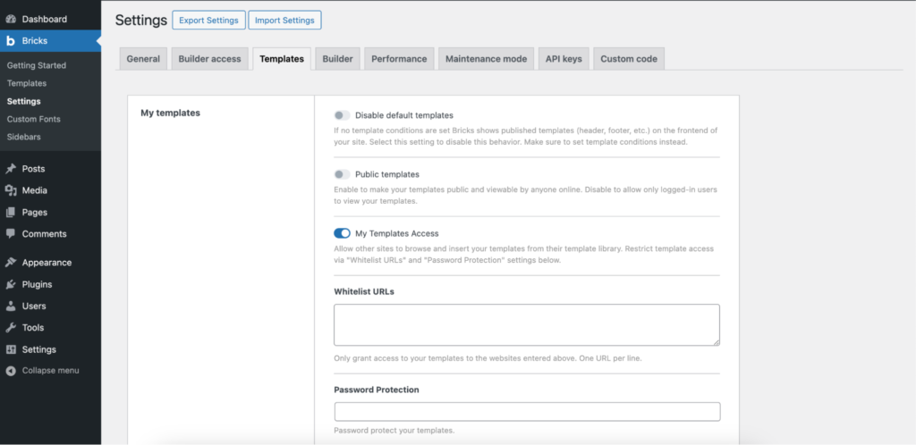 要允许其他网站使用你的 Bricks 模板,请进入 WordPress 面板中的 Bricks > Settings > Templates,然后启用 My Templates Access 复选框。