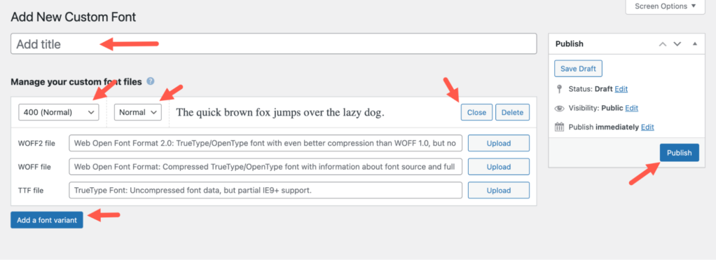 本部分允许您上传各种格式的字体文件,包括 WOFF2、WOFF 或 TTF。您还可以上传不同的字体变体,例如细体、半粗体、正常字体和粗体。
