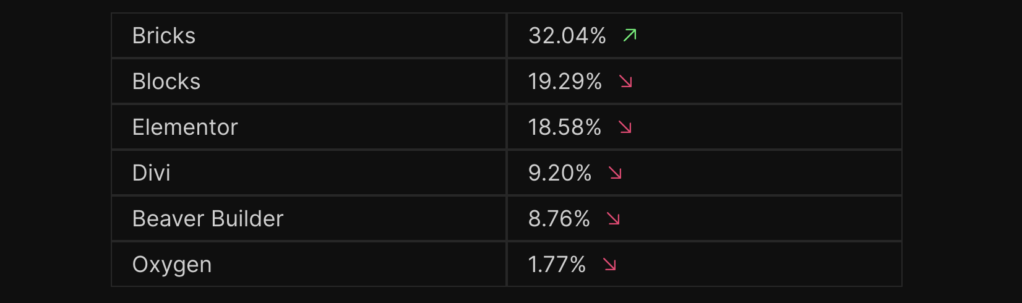 2024 年,The Admin Bar 对 1,144 名 WordPress 专业人士进行了一项调查,结果显示 “Bricks 是唯一一款使用人数比去年有所增加的页面生成器,占总数的 32%”,具体数据如下表所示: