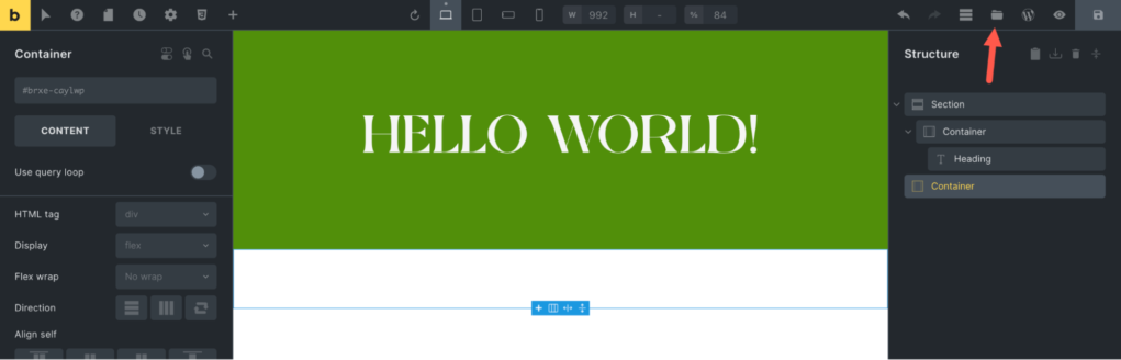 - 单击创建工具栏中的Templates (文件夹)图标,打开模板部分。如下图所示:将模板应用到 Bricks 页面。