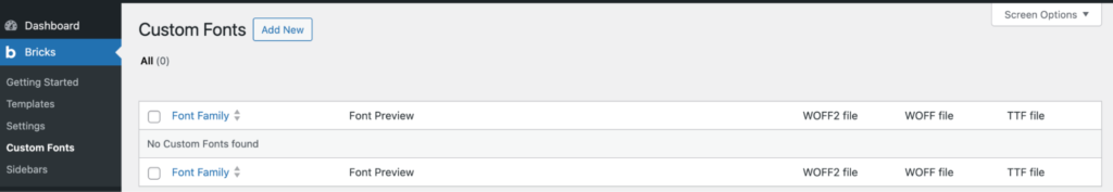 Bricks 提供了令人兴奋的功能,允许您将自定义字体上传到 WordPress 网站。为此,请导航至 Bricks > Custom Fonts。