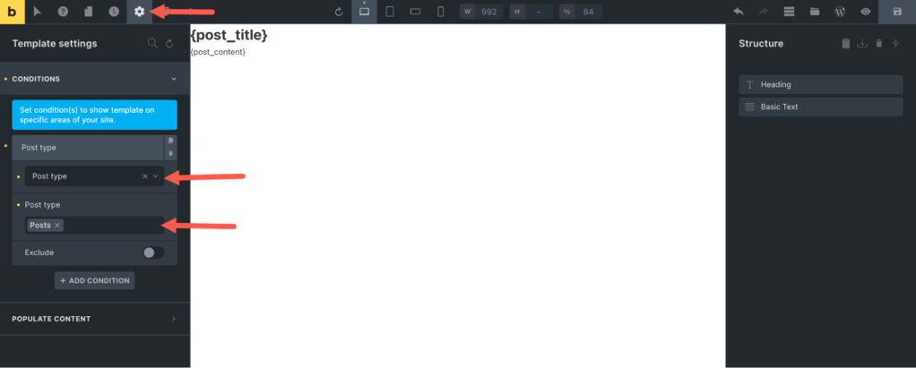 - 单击工具栏上的设置图标,转到Template Settings > POPULATE CONTENT。