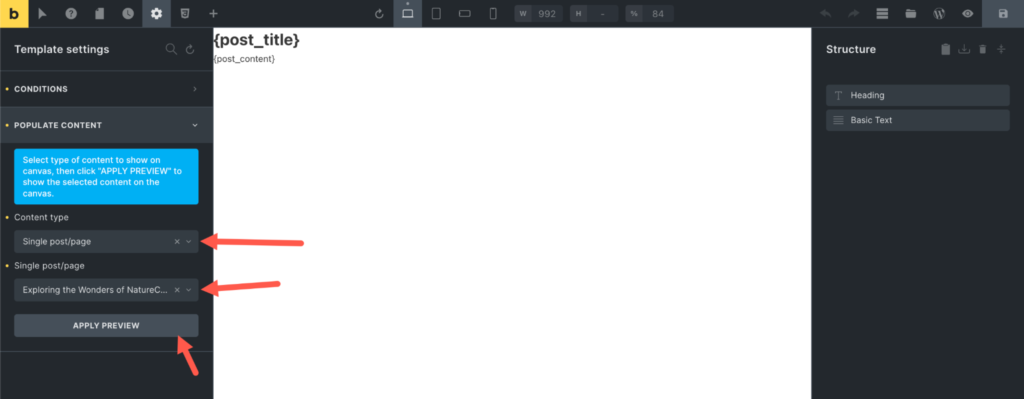 - 选择 Single post/page 作为内容类型,然后选择一个特定的帖子作为模板内容。如果没有出现,请确保搜索一个,然后点击 APPLY PREVIEW。如下图所示:添加默认文章作为动态元素的参考。
