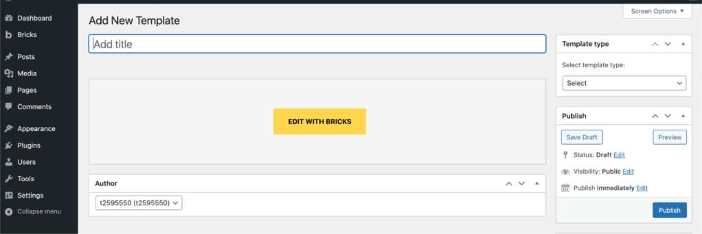- 导航至 Bricks > Template,创建一个新模板。为模板指定标题,将其类型设为Single,然后Publish或Save as draft。