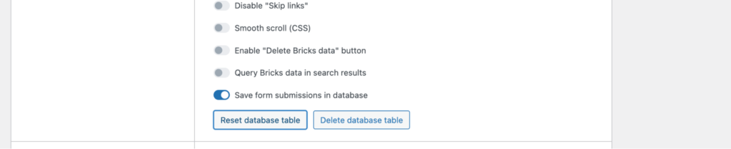 您还可以下载各种表单提交的 CSV 文件。在您配置此功能的 Bricks > Settings > General > Miscellaneous 部分,您可以重置或删除数据库表。