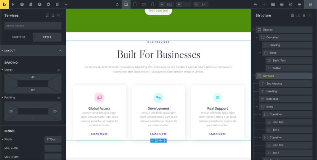 - Builder workspace(生成器工作区)– Bricks 的主要区域是生成器工作区,它是网站的可视化呈现。在这里,你可以直接与页面互动,拖动元素到位、调整大小和重新排列组件。