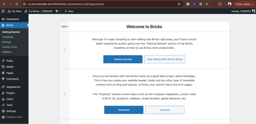 如果您想在购买前试用 Bricks,可以在 try.bricksbuilder.io 上建立试用账户。该平台提供了一个安装了 Bricks 的预配置 WordPress 网站,让您可以免费探索其特性和功能。