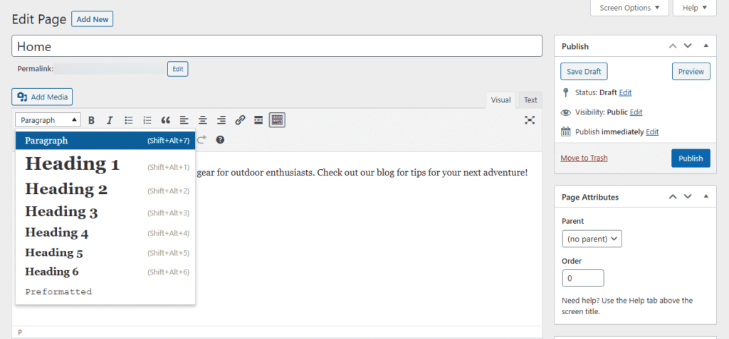 要添加文字,只需开始输入即可。默认情况下,文字将是一个段落,但您也可以使用下拉菜单创建标题或标题:
