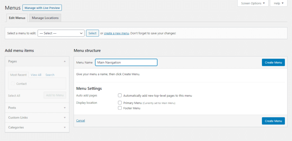 如果您还没有任何菜单,系统会提示您创建一个,您也可以选择 “创建菜单“按钮。您的菜单需要一个名称,以区别于您可能创建的其他菜单: