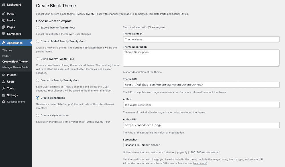 无论如何,在“Create Block Theme”屏幕上,你都会看到生成新主题的选项列表。我们不会在此一一介绍,但我们会选择克隆 Twenty Twenty-Four。无论如何,这都将显示一组选项和字段: