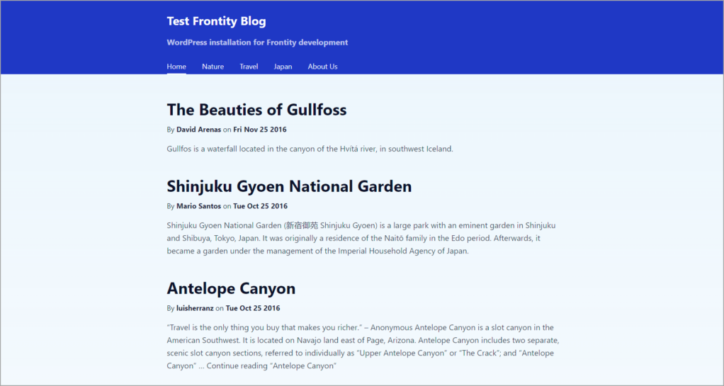 state.source对象名称从url改为api。 - 现在,重启 Frontity 网站。它将显示来自 WordPress 网站的内容: