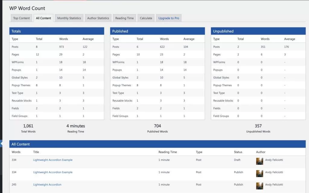 使用 WP Word Count 插件可以查看 WordPress 中所有已发布文章的综合字数。它还提供其他有用的工具,比如按字数对内容进行排序,这样您就可以看到网站上哪些文章的字数最多。