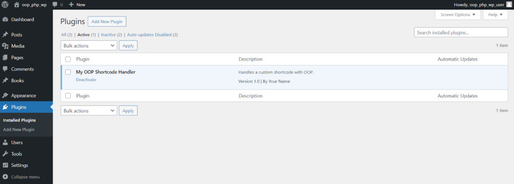 将其保存为 wp-content/plugins 目录中的 my-oop-shortcode-handler.php。最后,激活插件。