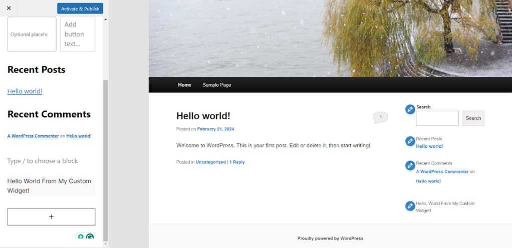 将以下代码添加到主题的 functions.php 文件或插件中。它定义了一个自定义小工具,用于显示 “Hello World From My Custom Widget!” 消息。