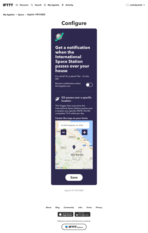 每个小程序都有一个触发器和至少一个动作。触发器是小程序执行一个或多个动作的信号。以国际空间站通知小程序为例:每次国际空间站经过用户所在位置时,它都会向安装了 IFTTT 应用程序的 Android 或 IOS 设备发送通知。