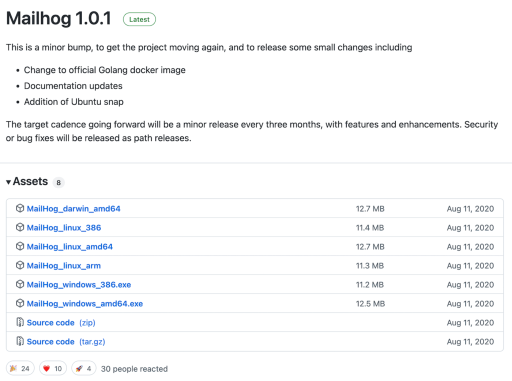 如果你使用的是 Windows 操作系统,请访问 MailHog Github 页面。在此查找并下载最新版本: