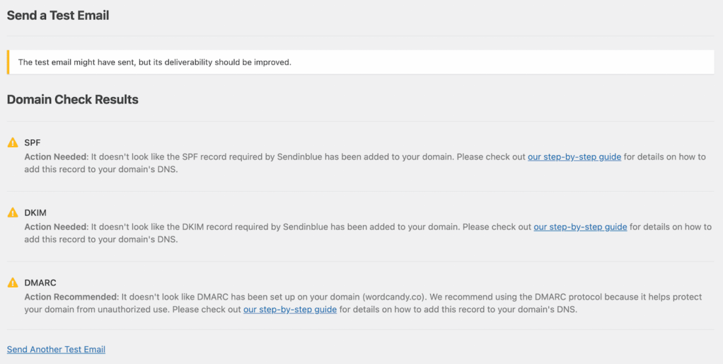 如果没有看到成功信息,可以尝试发送另一封测试邮件。或者,您可能需要用 SPF、DKIM 或 DMARC 配置您的 DNS 记录。不过,插件会通知您是否需要进行这些操作。