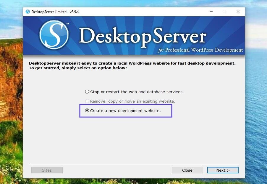 完成启用插件并启动Web和数据库服务后,下一个提示将是选择“Create a new development website”: