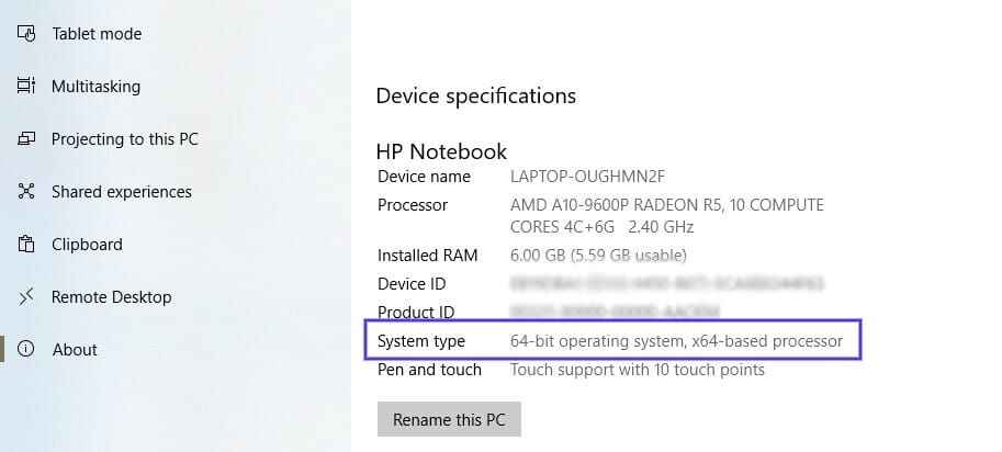 如果你不确定你的操作系统是32位或64位,以Win10为例,点击Windows开始按钮,在Settings(设置)>About(关于)找到系统版本信息: