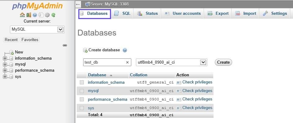 phpMyAdmin打开后,单击“数据库Databases”选项卡。为新建的数据库命名,然后选择Create: