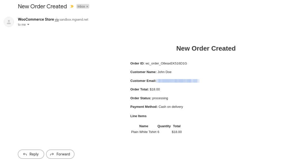 8. 访问您的商店并下订单。您应该会看到如下所示的电子邮件: