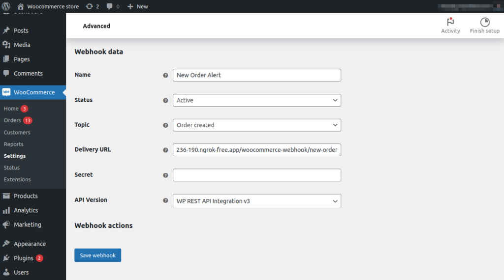 /woocommerce-webhook/new-order。这是新定义的接收 webhook 有效负载的端点。 - Secret: 留空。默认为当前 API 用户的消费者秘密。该秘密会在请求头中生成已交付网络钩子的哈希值。接收方可使用该秘密验证传入数据的真实性。如果签名与预期值相符,就能确认数据是由 WooCommerce 发送的,从而提供信任和安全性。